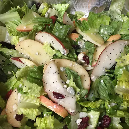 This is a delicious winter fruit salad with romaine, pear, apple, cranberries, and nuts.