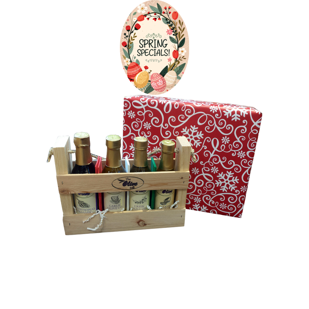 The same 4 bestsellers of extra virgin olive oil and vinegar (Traditional Balsamic, Greek Oil, Lemon Oil and Garlic Oil) as our regular sampler pack, in our special wooden crate, all wrapped up in festive red holiday paper!!