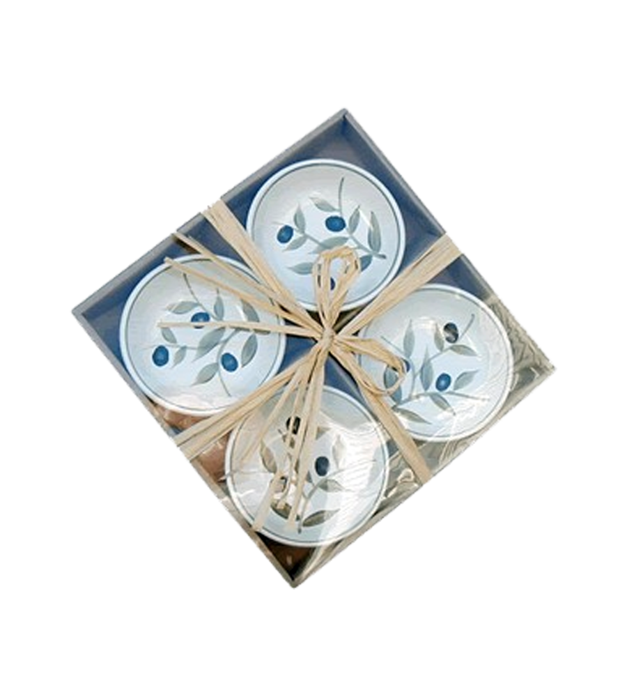 Gift set contains 4 round dipping bowls with olives imprinted.