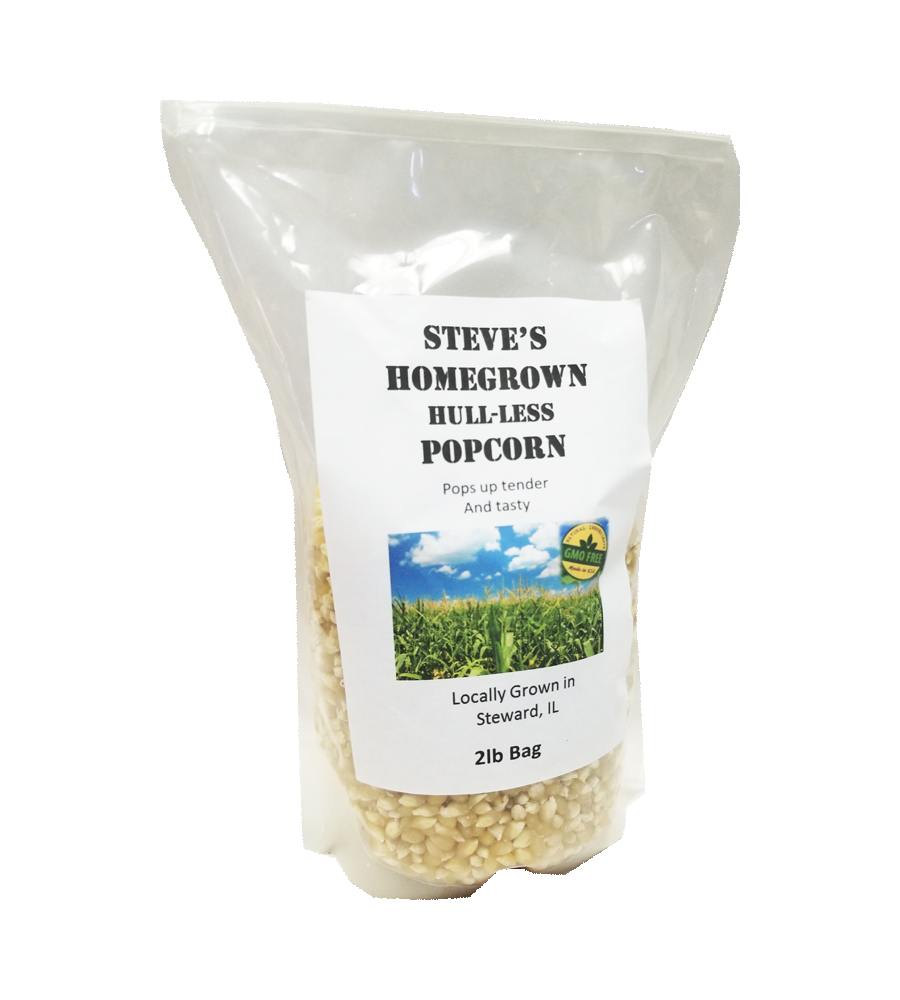 White hull-less popcorn grown in Steward, Illinois. Popcorn up tender and tasty without the hard hulls!